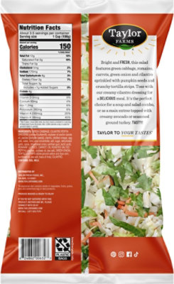 There are 150 calories in 1 cup 100 g of Taylor Farms Southwest Chopped Salad. Track calories carbs fat sodium sugar 14 other nutrients. Product Features Washed and ready to enjoy Ready in less than 3 minutes Complete salad kit including unique toppings dressing Includes buffalo seasoned croutons Includes creamy.